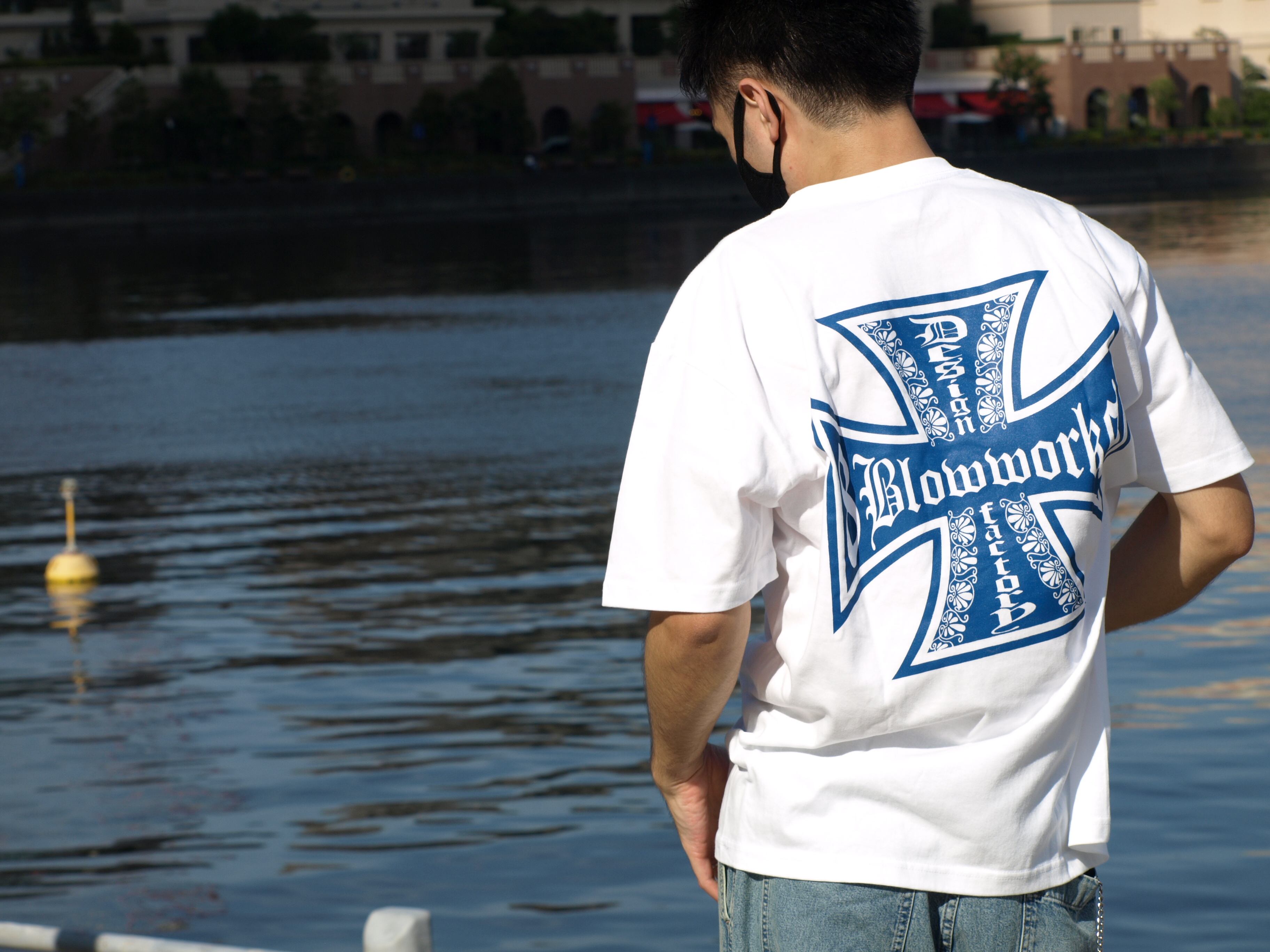 夏に眩しい純白のホワイトにオリジナルに調合したブルーインクをプリント。