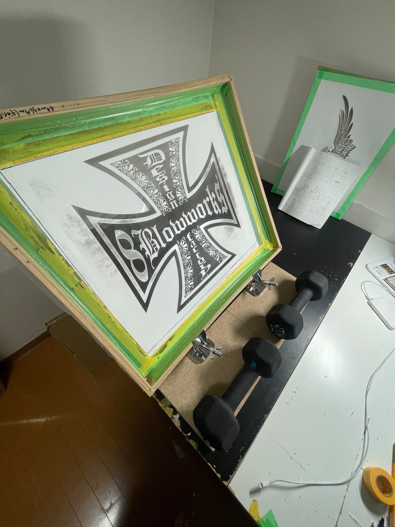 パーカーと同様、カッティングマシンを使用して自作したシルクスクリーン版を使用して一枚一枚丁寧にプリント。